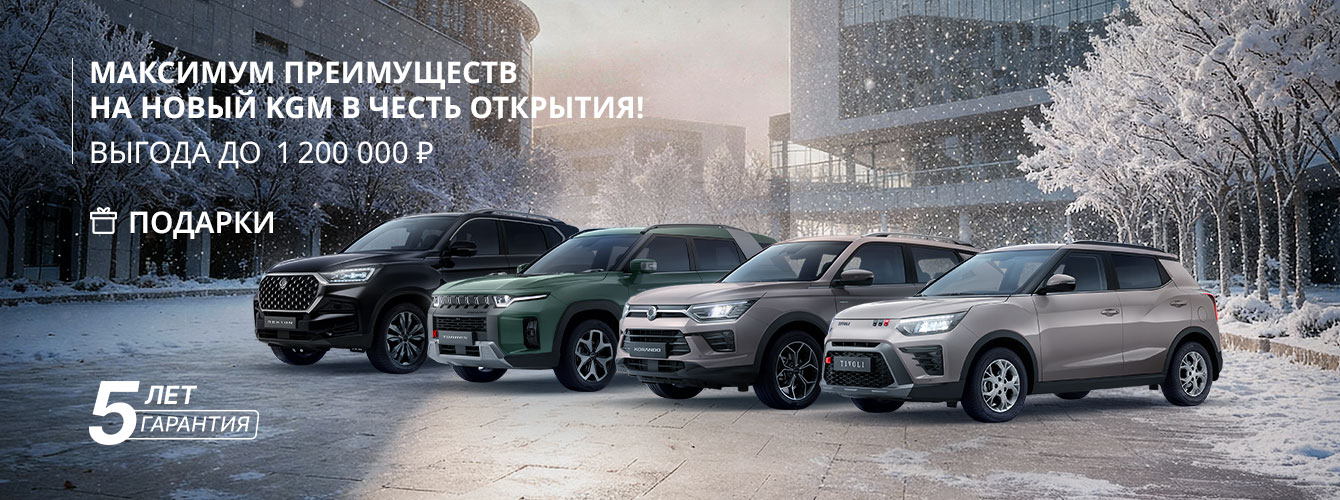 Прямая выгода в виде прямой скидки на модели KGM действительна для автомобилей 2024 года производства, действует с 01.02.2026 г. по 28.02.2026 г., не является офертой.